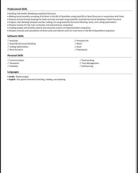 مهندس مدني حديث التخرج متواجد في الامارات تخصص Planning اشتغلت في مشروع وشاركت في أعمال التخطيط والمتابعة. بستخدم AutoCAD - Primavera P6 - MS Project نزلت موقع وتابعت تسلسل أعمال التنفيذ وربطته بال Planning. عندي استعداد أتعلم وأطور نفسي، وقادر على العمل تحت ضغط وفي فريق عمل. بدور على فرصة شغل تساعدني أزود خبرتي العملية. للتواصل