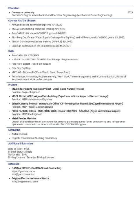 Mechanical Engineer in Dubai with 3 + years of UAE experience in MEP, HVAC, and project management. I hold a UAE driving license, am a Society of Engineers member, and am OSHA certified. Skilled in AutoCAD, Duct Sizer, and managing projects from planning to Civil Defense & municipal compliance. Fluent in English for reports and contracts. Certificate attested & Recognized UAE