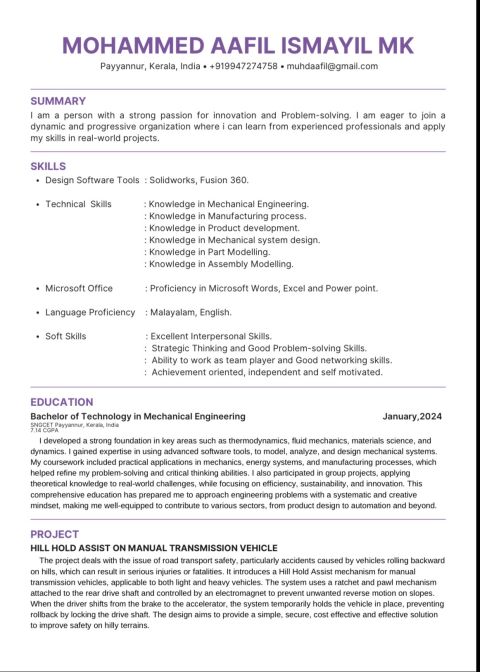 Fresh Mechanical Engineer based in Sharjah, with strong skills in AutoCAD, SolidWorks, and Microsoft Office applications. Actively seeking a suitable entry - level mechanical engineering position, with a high willingness to learn, grow, and contribute effectively to the team