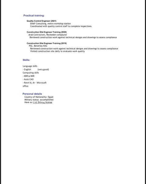 Civil Engineer with 9 years of experience in construction and site supervision, including high - rise buildings, and villas, works. Skilled in quality control, site execution, and project coordination. Holder of SOE Card Holder of Sharjah Municipality Card I am currently seeking a suitable opportunity as a Civil Engineer/ Site Engineer/ civil Inspector