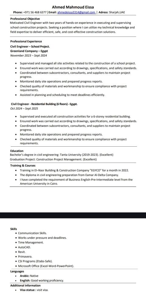 أنا مهندس مدني خريج دفعة 2023، ابحث عن فرصة عمل في مجال التنفيذ أو الاشراف أو المكتب الفني داخل دولة الامارات العربية المتحدة. أجيد استخدام برامج الاوتوكاد والاكسل وبرامج الهندسة المختلفة متواجد حاليا في الامارات بتأشيرة زيارة وجاهز للعمل فورا