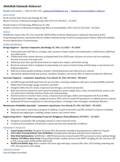 Mechanical Engineer with Bachelor’s and Master’s degrees from the United States and over two years of experience in the USA in process engineering, mechanical design, commissioning, and operations. Seeking a suitable opportunity in Saudi Arabia in mechanical engineering, maintenance, process, or manufacturing. Contact