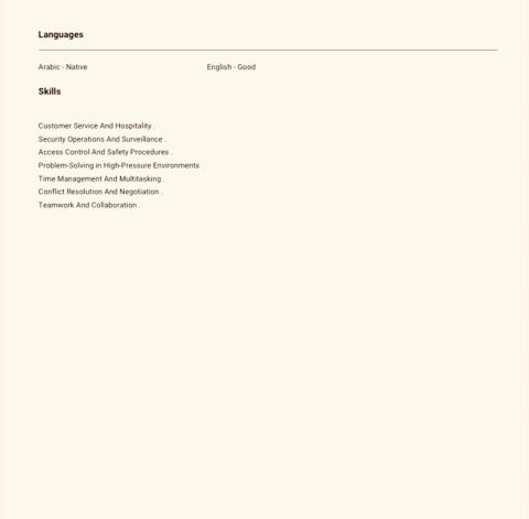 رجل أمن عام يتمتع بخبرة جيدة في مجال الأمن والسلامة، قادر على التحدث باللغة الانجليزية والتواصل بفاعلية مع الزملاء والزوار. أتميز بالقدرة على مراقبة الوقت والأفراد، والعمل تحت الضغط، واتخاذ القرارات بحكمة في المواقف الصعبة. كما امتلك مهارة عالية في تهدئة المواقف وامتصاص غضب الآخرين، مع التزام كامل بالنظام والانضباط في العمل