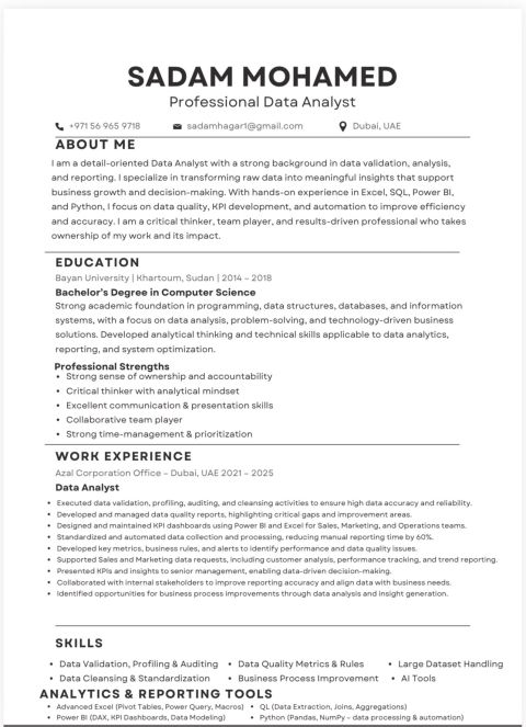 باحث عن عمل اداري / منسق عمليات بخبرة 4 سنوات داخل دولة الامارات في الإدارة والمشتريات وتنسيق العمليات، أو أي فرصة عمل مناسبة. متمكن من استخدام الكمبيوتر وبرامج Microsoft Office وأنظمة ERP، مع خبرة في اعداد التقارير وتنظيم العمل والتواصل مع الادارات. تخصصي علوم كمبيوتر، أجيد اللغة الانجليزية، أحمل رخصة قيادة سارية، سوداني الجنسية، وجاهز للعمل فورا