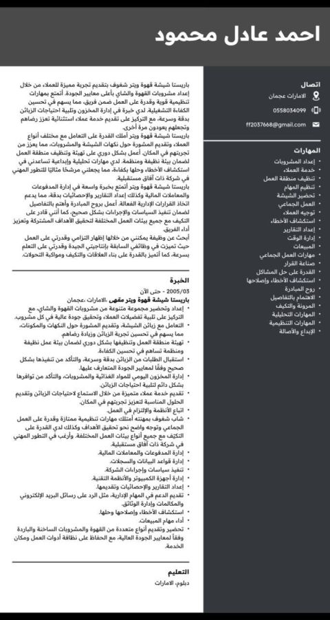 I am a 27 - year - old Sudanese man with a valid residency permit (transferable) and I am looking for a job in reception, customer service, or a garage in Mushrif. I am committed and serious about work, I know how to deal with customers, and I am ready to start immediately. If a suitable opportunity arises, Id appreciate it