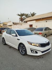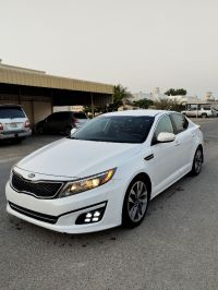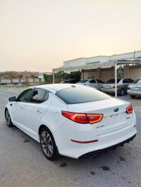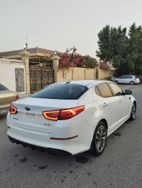 Kia Optima 2015 SX model with 162,000 miles, pearl white color. The car is fully equipped except for sunroof. It has a 2.4L gasoline engine with 6-speed automatic transmission, 18-inch wheels. The car features keyless start and entry, rear air conditioning, automatic headlight control, cruise control, Eco system for fuel efficiency, and blind spot warning system. Price: 19,000 AED. Location: Umm Al Quwain emirate.