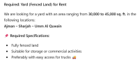 مطلوب حوطة (أرض مسورة) للإيجار نبحث عن حوطة بمساحة تتراوح من 30000 الى 45000 قدم مربع في المناطق التالية عجمان - الشارقة - أم القيوين المواصفات المطلوبة أرض مسورة بالكامل مناسبة للتخزين أو الأنشطة التجارية يفضل توفر مدخل سهل للشاحنات