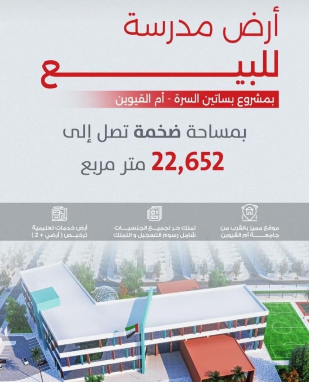 School Land for sale - Basateen Al Surra Project, Umm Al Quwain Excellent investment opportunity for sale School land located in Basateen Al Surra Project, Umm Al Quwain. Plot area 22652 SqFt. Price AED35000000