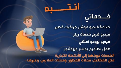 أقدم مجموعة متكاملة من الخدمات الابداعية الموجهة لأصحاب الأنشطة التجارية، تشمل تصميم فيديوهات ترويجية - تصميم فيديوهات تعريفية بالعلامة التجارية - تصميم فيديو موشن جرافيك احترافي - تصميم بوستات احترافية لوسائل التواصل الاجتماعي - جلسات تصوير احترافية لمنتجات الأعمال اعمل بنظام الفريلانسر، مع الالتزام التام بجودة العمل وتسليم المشاريع في الوقت المحدد، بما يضمن لك حضورا بصريا قويا يعكس هوي
