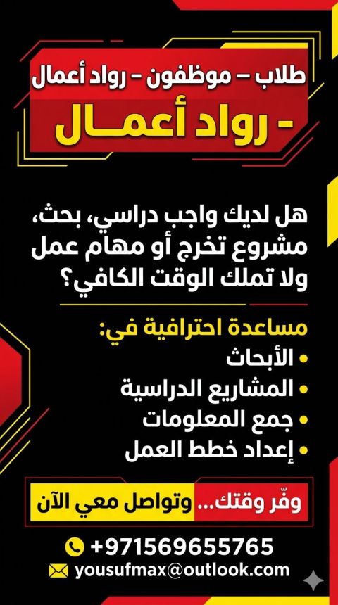 طلاب - موظفون - رواد أعمال هل لديك واجب دراسي، بحث، مشروع تخرج، أو مهام عمل ولا تملك الوقت الكافي لانجازها أوفر لك المساعدة في اعداد الأبحاث، المشاريع، جمع المعلومات، وخطط العمل بسرعة واحترافية. وفر وقتك واترك المهمة لمن ينجزها باتقان. تواصل معي الآن