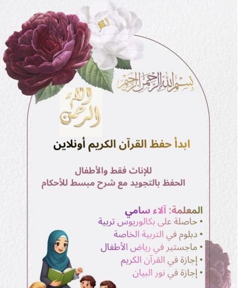 أنا محفظة قرآن كريم وتأسيس لاحكام التلاوة والقراءة في اللغة العربية بطريقة متقنة وميسرة ومتابعة المناهج المدرسية لصفوف الحلقة الأولى
