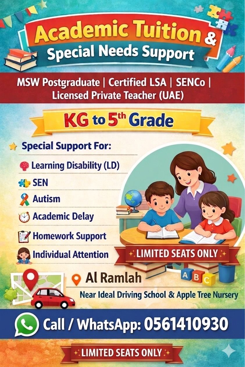 أقدم دروس خصوصية ودعم تعليمي للاطفال، بما في ذلك الاطفال ذوي الاحتياجات الخاصة. رقم التواصل / واتساب الموقع الرملة قريب من مدرسة القيادة المثالية وروضة ابل تري