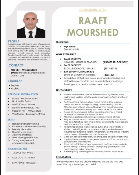 حسين من سوريا مقيم منذ ست سنوات في دبي. لدي خبرة في المبيعات وخدمة العملاء. لدي سيارة وإقامة ولغة أجنبية جيدة جدا. ابحث عن عمل