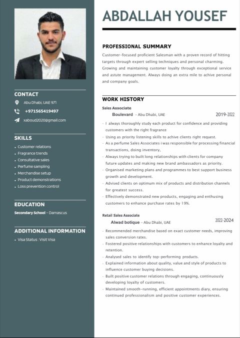 اسمي علي عبد السلام، 25 سنة متواجد حاليا في الامارات وابحث عن عمل في مجال المبيعات بدوام كامل أتميز بمهارات قوية في التواصل والاقناع وخدمة العملاء ولدي القدرة على تحقيق الأهداف وزيادة المبيعات من خلال بناء علاقات ناجحة مع العملاء. متفرغ تماما ومستعد للانضمام فورا للعمل بروح الفريق وتحت أي ضغط