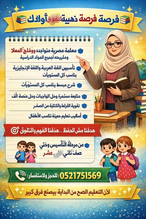 فرصة ذهبية لتفوق أولادك معلمة مصرية متواجده في الزيد وفلج المعلا ومليحة لجميع المواد الدراسية تأسيس قوي في اللغة العربية واللغة الانجليزية شرح مبسط يناسب كل المستويات متابعة مستمرة وحل الواجبات وحل منصة ألف والبوابة أول بأول تقوية القراءة والكتابة من الصفر أساليب تعليم حديثة تناسب الاطفال هدفنا مش الحفظ هدفنا الفهم والتفوق من مرحلة التأسيس وحتى صف ثاني عشر