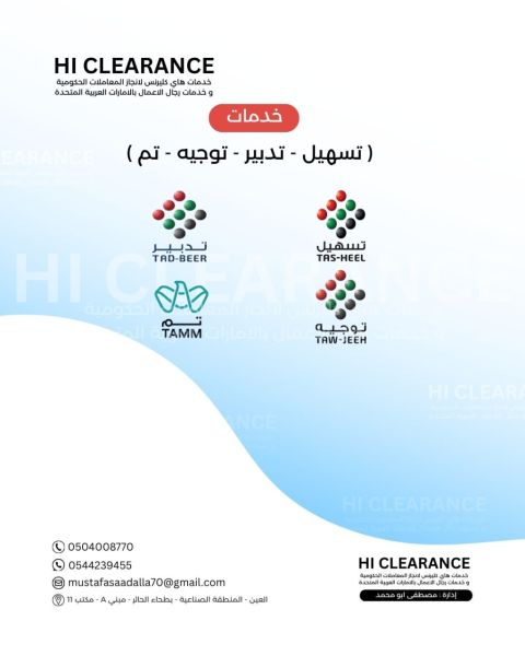 مكتب هاي كليرنس تخليص معاملات للأفراد والشركات بكفاءة، خبرة أكثر من 15 عام بتخليص معاملات التنمية الاقتصادية والجوازات والقضائية والبلدية والمرور وتقدم أفضل الأسعار تخليص ومتابعة المعاملات الحكومية تخليص معاملات الجوازات اصدار تصارح المغادرة للأفراد والأسر بسرعة واتقان
