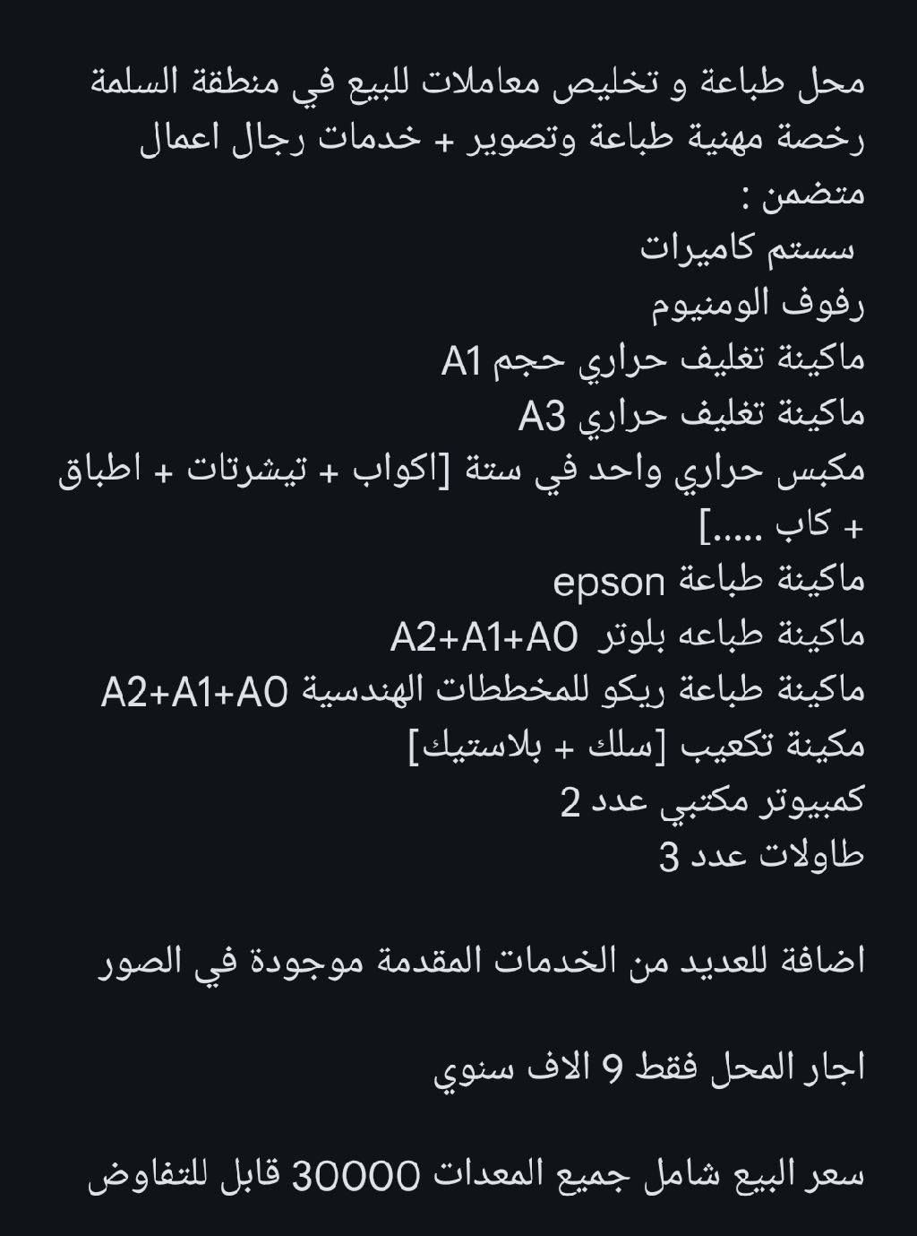 محل طباعة وتخليص معاملات للبيع في منطقة السلمة رخصة مهنية طباعة وتصوير + خدمات رجال أعمال إيجار المحل فقط 9 ألاف سنوي سعر البيع شامل جميع المعدات 30000 قابل للتفاوض
