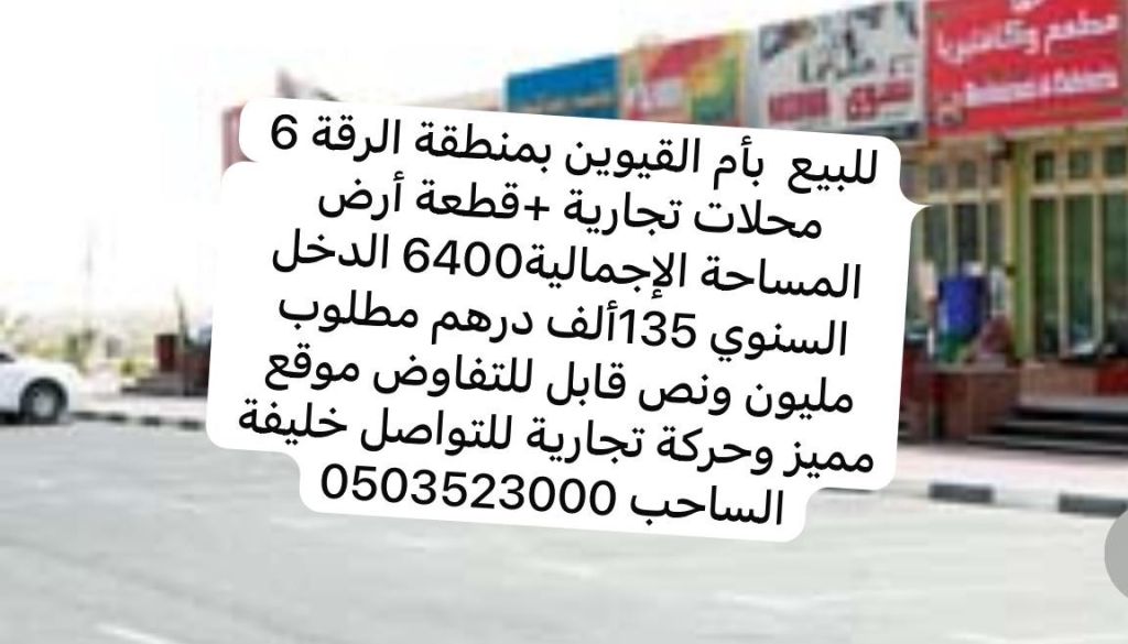 للبيع في أم القيوين بمنطقة الرقة 6 محلات تجارية + قطعة أرض المساحة الاجمالية 6400 الدخل السنوي 135 ألف درهم مطلوب مليون ونصف قابل للتفاوض موقع مميز وحركة تجارية (حصري) للتواصل خليفة الساحب