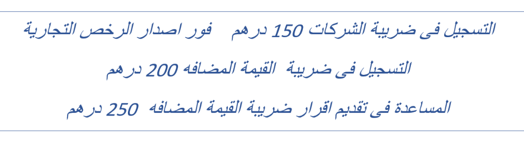 التسجيل في ضريبة الشركات 150 درهم فور اصدار الرخص التجارية التسجيل في ضريبة القيمة المضافة 200 درهم المساعدة في تقديم اقرار ضريبة القيمة المضافة 250 درهم
