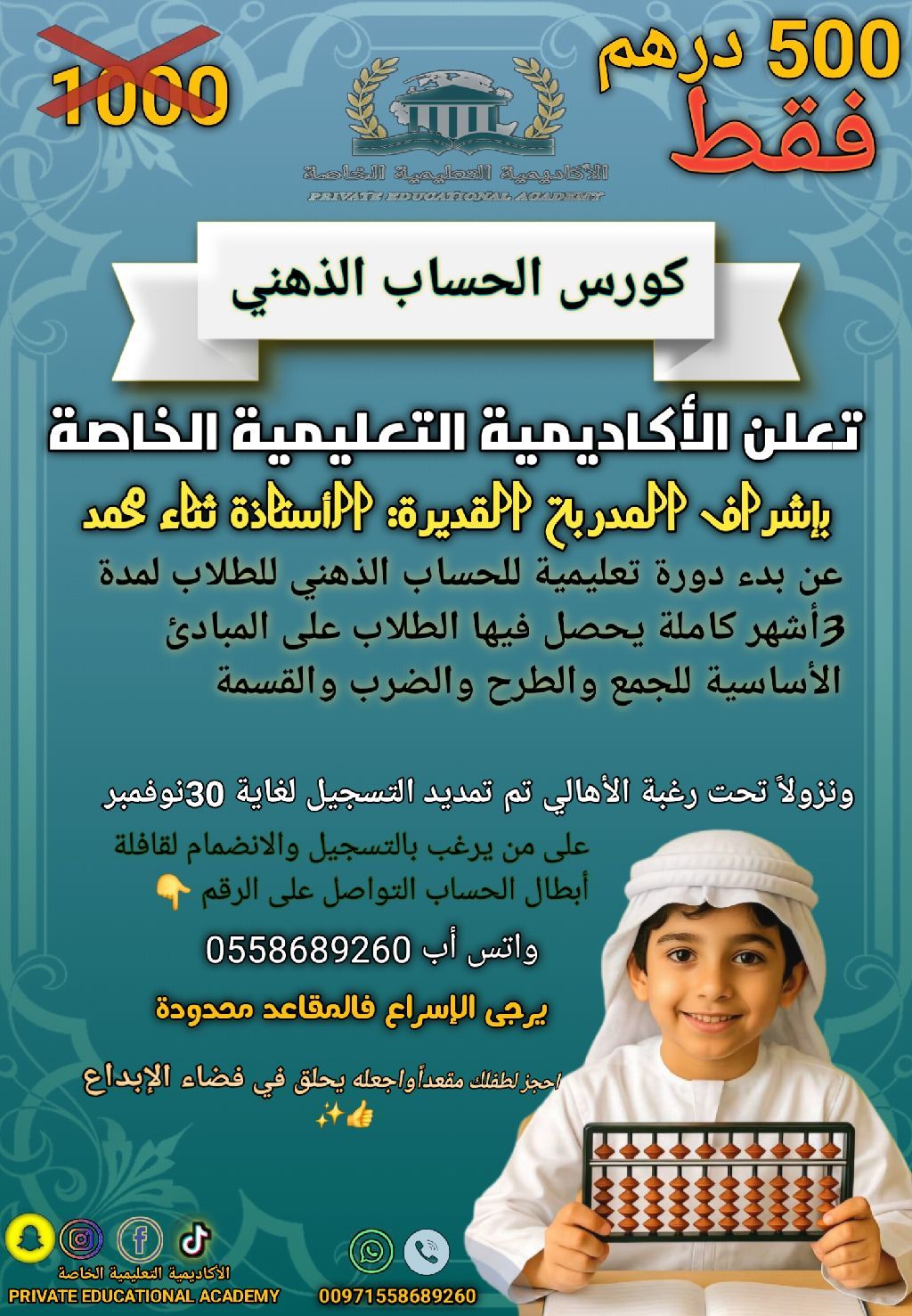وداعا للآلة الحاسبة فكر أسرع من البرق. سجل الآن، غير مستقبله. ذكاء طفلك ينتظر الأبا كوس (التخيلي) مفتاحه. 30 دقيقة يوميا عبقرية رياضيات. مخ طفلك هو السوبر كمبيوتر الجديد. نحوله من الصفر. ابدأ الرحلة الاونلاين. التركيز والسرعة لدينا الكورس. لا حدود للعقل. انقر للتسجيل. لعبة وليست دراسة. مهارات ذهنية مدى الحياة. مقاعد محدودة. احجز الآن ولا تتردد. للاستفسار
