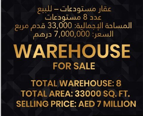 مستودعات للبيع على مساحة 33 ألف قدم مجهزة بالكامل كهرباء عالية دخل سنوي 700 ألف مطلوب 7 مليون درهم