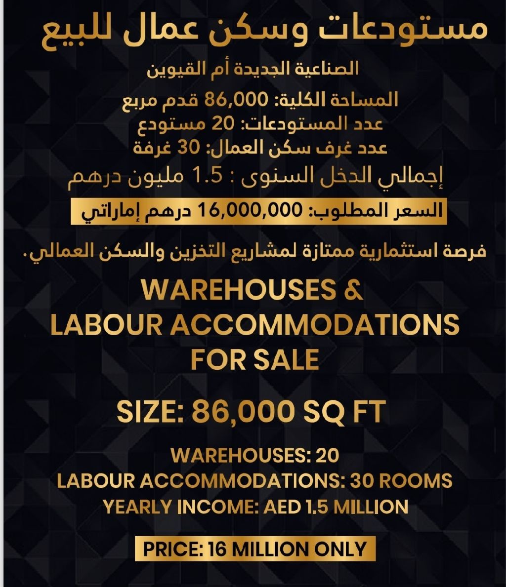 مستودع للبيع بمساحة 86 ألف قدم بدخل سنوي 1.5 مليون درهم يتكون من 20 مستودع وسكن عمال فرصة استثمارية ممتازة سعر البيع 16 مليون درهم