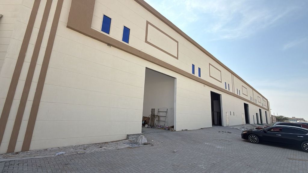 مجمع مستودعات وشوروم جديد للإيجار في أم القيوين الصناعية الحديثة اجمالي الكهرباء 540 كيلو فولت أمبير كهرباء 100 كيلواط للصيانة، محل كبير 90 كيلواط، محل صغير 45 كيلواط مطلوب 45 درهم للقدم المربع