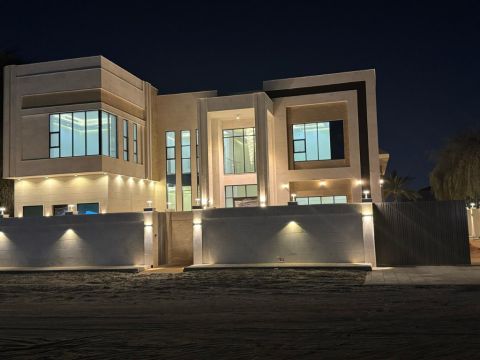 In Al Ramaqiya Area - Wasit suburb - Emirate of Sharjah A brand - new first - occupancy villa is available for sale in a prime location, positioned on a corner with two streets and directly facing the mosque. The Villa features an elegant two - floor design with generous spaces offering a sophisticated and harmonious lifestyle. It includes six master bedrooms with dressing rooms, two Majlis areas, and two