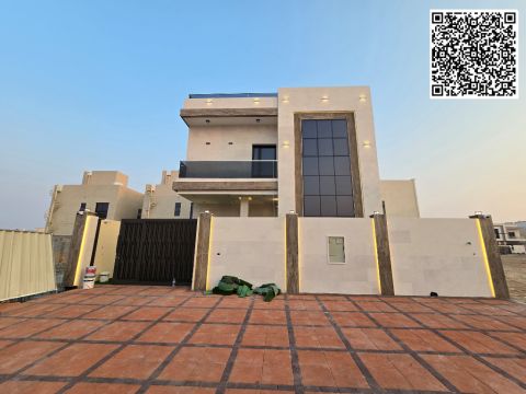 Luxury villa for sale in Al Alia - Ajman Luxurious stone facade with a modern entrance and elegant design Exterior and interior landscapes create an atmosphere of luxury and comfort A very strategic and distinguished location with a 9 - meter front setback + additional parking spaces on the opposite side Smart entry and Smart home systems Surveillance cameras and comprehensive warranties Just one minute