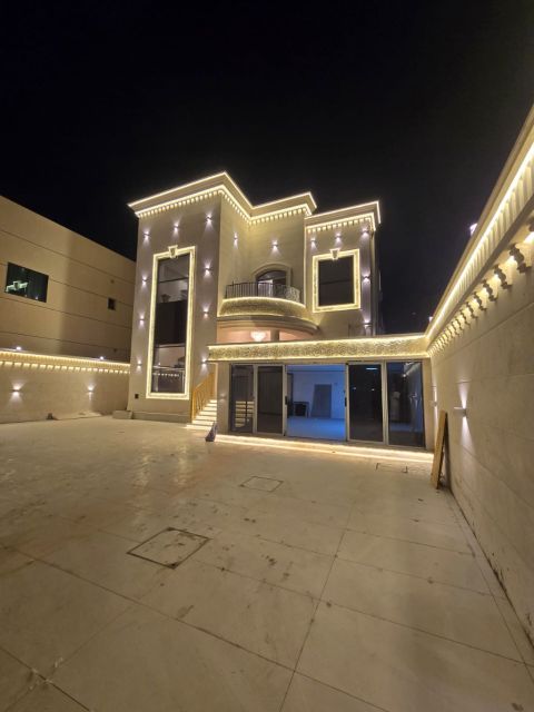 Luxury villa for sale in Al Hoshi - Al Badea, plot 10000 SqFt, built - up 7000 SqFt, personal high - end finishing, central AC, freehold for Arabs, price AED4500000. Includes Majlis, large living hall, kitchen, 5 master bedrooms, maid room, laundry, spacious yard, parking, on 18m road, near mosque