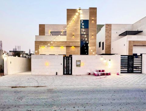 Luxury villa for rent in Al Yasmin area, Ajman Area 3014 SqFt 5 master bedrooms Maid's room Price AED100000 payable in 4 installments Contact via