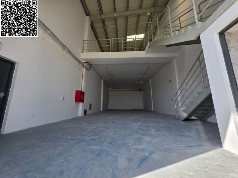 A large warehouse on the main street in the Al Jarf Industrial Area, with a very large parking area for trucks. It has two large main entrances, a large rear entrance, and several smaller service entrances. Suitable for a wide range of businesses. Approximately 15000 square feet. Ground floor area 8800 square feet. Mezzanine area 6160 square feet. Includes offices and restrooms. Equipped with