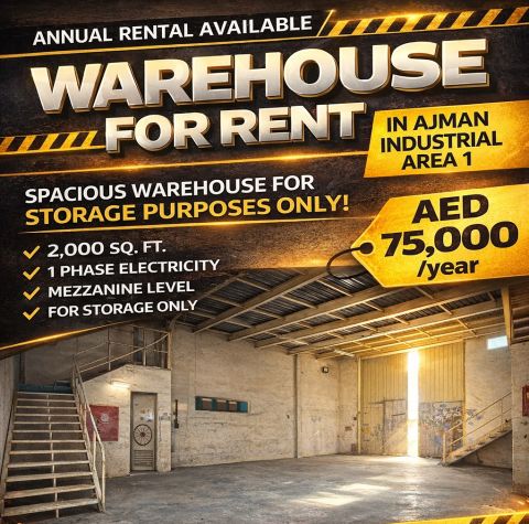 Warehouses for rent - Al Jerf Industrial Area, Ajman Prime opportunity to rent warehouses in a strategic location at Al Jerf Industrial Area - Ajman, fully equipped and suitable for storage or Industrial activities. Warehouse Details Location Al Jerf Industrial Area - Ajman Available units 6 warehouses Size per warehouse 2940 SqFt with mezzanine Electricity 22 kW - 3 phase easy access for trucks
