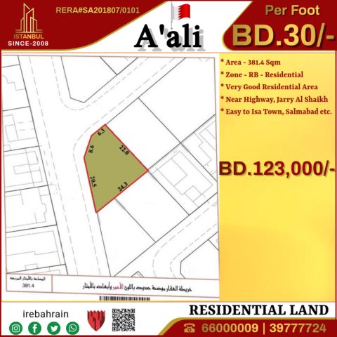 أرض سكنية RB للبيع في عالي - 30 دينار بحريني للقدم. اكتشف الفرصة الاستثمارية المثالية في موقع عالي المتميز. الميزات الرئيسية الموقع في عالي، حي هادئ ومرموق. مساحة الأرض 381.4 متر مربع (قطعة أرض زاوية) التصنيف RB - مجمع سكني. السعر 30 دينار بحريني للقدم (الاجمالي 123000 دينار بحريني فقط) أبرز النقاط قطعة أرض زاوية توفر مساحة اضافية ومرونة في التصميم. سهولة الوصول الى الطريق السريع للاتصال المريح