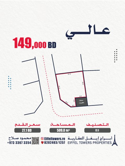 For sale: An investment land in the Al-Hali area, in a prime location opposite Khalifa bin Salman Street, classified as B3 for buildings. The land area is 509.3 square meters. The price per foot is 271,793 dinars, with a total price of 149,000 dinars only. For contact and inquiries: Nizar Al-Saghir Abdelfattah Hassan, Masar Al-Mustaqbal Real Estate. Properties - Bahrain, Lands - For Sale - Bahrain, Al-Hali, Investment Land, Street - Khalifa - Bin - Salman, Masar - Al-Mustaqbal - Real Estate, Real Estate Investment.