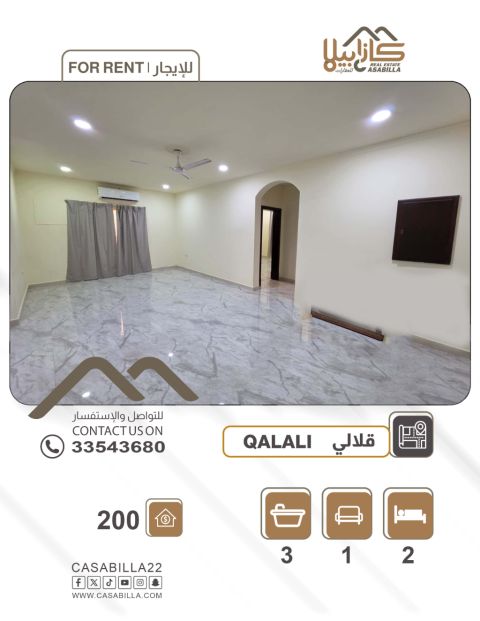 For rent: An apartment in the Qalali area. First, apartment details: 2 master bedrooms, a maid's room, a laundry room, a spacious living room with a bathroom, and 3 bathrooms. Second, facilities and services: elevator, parking space, close to markets and commercial shops. Rental price: 200 dinars excluding electricity. For contact.