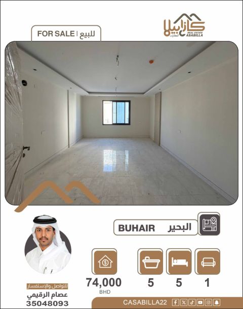 For sale: A luxurious apartment in the Al-Buhair area. First, apartment details: 4 bedrooms (one of them is a master bedroom), 3 bathrooms, a spacious living room, and a kitchen with all its appliances as shown in the picture. Second, facilities and services: Close to all services (mosque, schools, markets, and parks). Basement parking, elevator, with AC split units, and with the furniture as pictured. Area: 132.3. Price: 65, negotiable. Contact for inquiries.