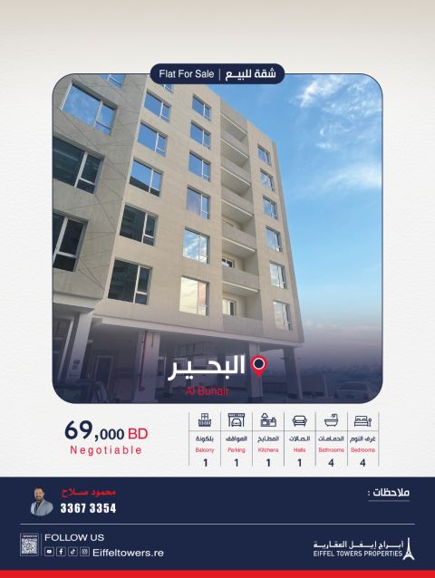 Eiffel Towers Real Estate Company offers two apartments for sale in Al-Buhair. The apartment area is 200 square meters. Apartment details: 4 bedrooms, 1 living room, 1 kitchen, 4 bathrooms. Facilities and services include a parking space and a balcony. Ownership is allowed for Gulf nationals. It is close to all services. The total price is 69,000 Bahraini dinars. For contact: Mahmoud Salah, eiffeltowers.re, eiffeltowers.re, a broker certified by the Real Estate Regulatory Authority, license number B202403/1257.