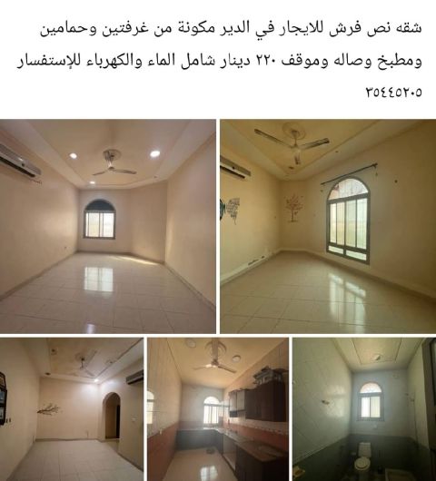 Apartment for rent in Al-Deir, with two bedrooms, two bathrooms, a living room, a kitchen, and a parking space. The building consists of a ground floor and a first floor without an elevator. The building is clean and tidy in a prime and quiet location. The price is 140 Bahraini dinars excluding services, or 200 Bahraini dinars including electricity, water, and municipality fees. For contact via.
