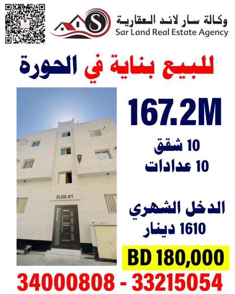 A building in Al-Hoora with an area of 1799.7 square feet, consisting of 10 apartments: 6 with 2 bedrooms and 2 bathrooms, and 4 with 1 bedroom and 1 bathroom. There are 10 electricity meters. The monthly income is 1610 dinars. The asking price is 180,000 dinars.