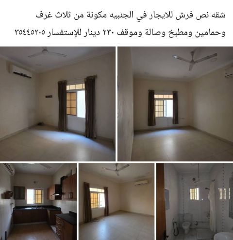 شقة نصف مفروشة للإيجار في الجنبية، مكونة من ثلاث غرف وحمامين ومطبخ وصالة وموقف سيارات بسعر 230 دينار.