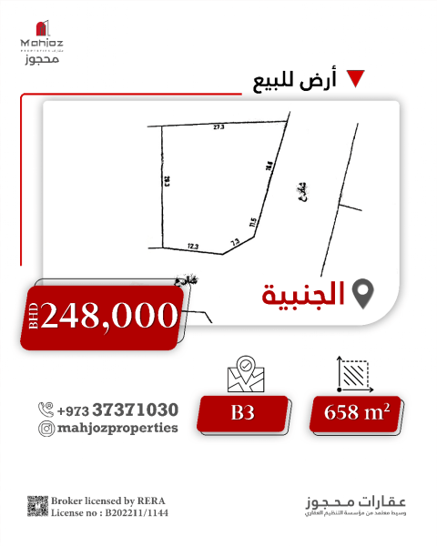 For sale, a land in Janabiyah area (Sheikh Khaled Plan) Location Janabiyah Area 608 SQM. Classification BD (buildings up to 6 floors) Price 215969 Bahraini dinars. Contact us for more information 00973 - Reserved Properties (Mahjoz Properties)