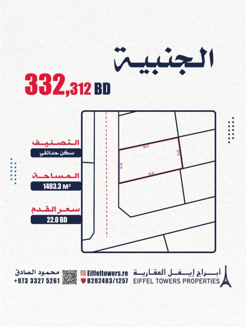 Eiffel Towers Real Estate Company offers for sale a land in Al Janabiya with an area of 1403.3 square meters, classified as residential garden - RG. The price per square foot is 22 Bahraini dinars, and the total price is 332,312 Bahraini dinars. For contact, reach out to Mahmoud Al-Sadiq via eiffeltowers.re. The company is an intermediary certified by the Real Estate Regulatory Authority with license number B202403/1257.