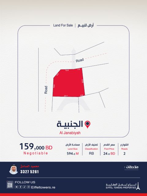 Eiffel Towers Real Estate Company offers for sale a land in Janabiya with an area of 594 square meters, classified as private residential (RB). The price per square foot is 24.8 Bahraini dinars, and the total price is 159,000 Bahraini dinars. For contact, reach out to Mahmoud Al-Sadiq via eiffeltowers.re. The company is a certified broker licensed by the Real Estate Regulatory Authority under license number B202403/1257.