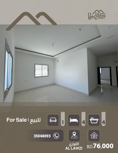 For sale, an apartment in Al Lawzi divided into two units, on the 3rd floor, area 266 square meters, building age 5 years. The building has 6 floors, each floor with an apartment having two entrances. The first unit consists of 2 rooms, a hall, one bathroom, a balcony, and a kitchen. The second unit has 4 bedrooms, a hall, 3 bathrooms, a large kitchen with a balcony, and a hall. The entire apartment totals 6 rooms, 4 bathrooms, 2 halls, 2 kitchens, and 2 balconies. Price 74,000 negotiable.
