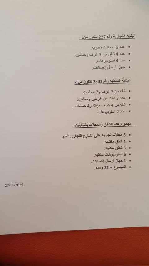 For sale Two buildings on the same deed, residential and commercial, in Jid Ali. Land area is 759.6 SQM. The first building consists of 6 commercial shops, 4 apartments with 3 bedrooms, and 4 studios. The second building consists of 3 apartments with 2 bedrooms, 2 studios, one apartment with 7 bedrooms, and one furnished apartment with 4 bedrooms. Total number of apartments and shops in