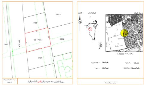 For sale: a residential land plot in Al-Malikiyah. Area: 400.5 square meters. Classification: residential RB. Price per square foot: 25 dinars. Total price: 107,774 dinars.