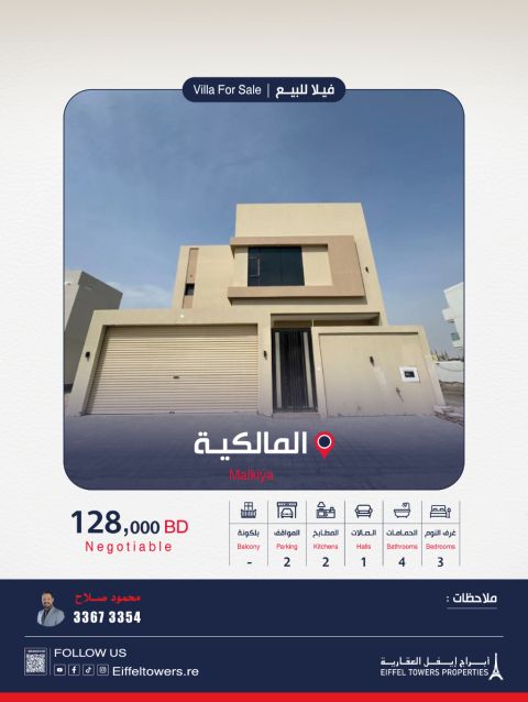 أماكن عقارية للبيع: فيلا في المالكية. مساحة الأرض: 198 متر مربع. مساحة البناء: 268.2 متر مربع. تتكون من أربع غرف نوم، وخمسة حمامات، ومطبخين، وصالتين، وموقفين للسيارات، وملحق للعاملة المنزلية. السعر المطلوب: 127 ألف دينار. المرجع: VS1136.