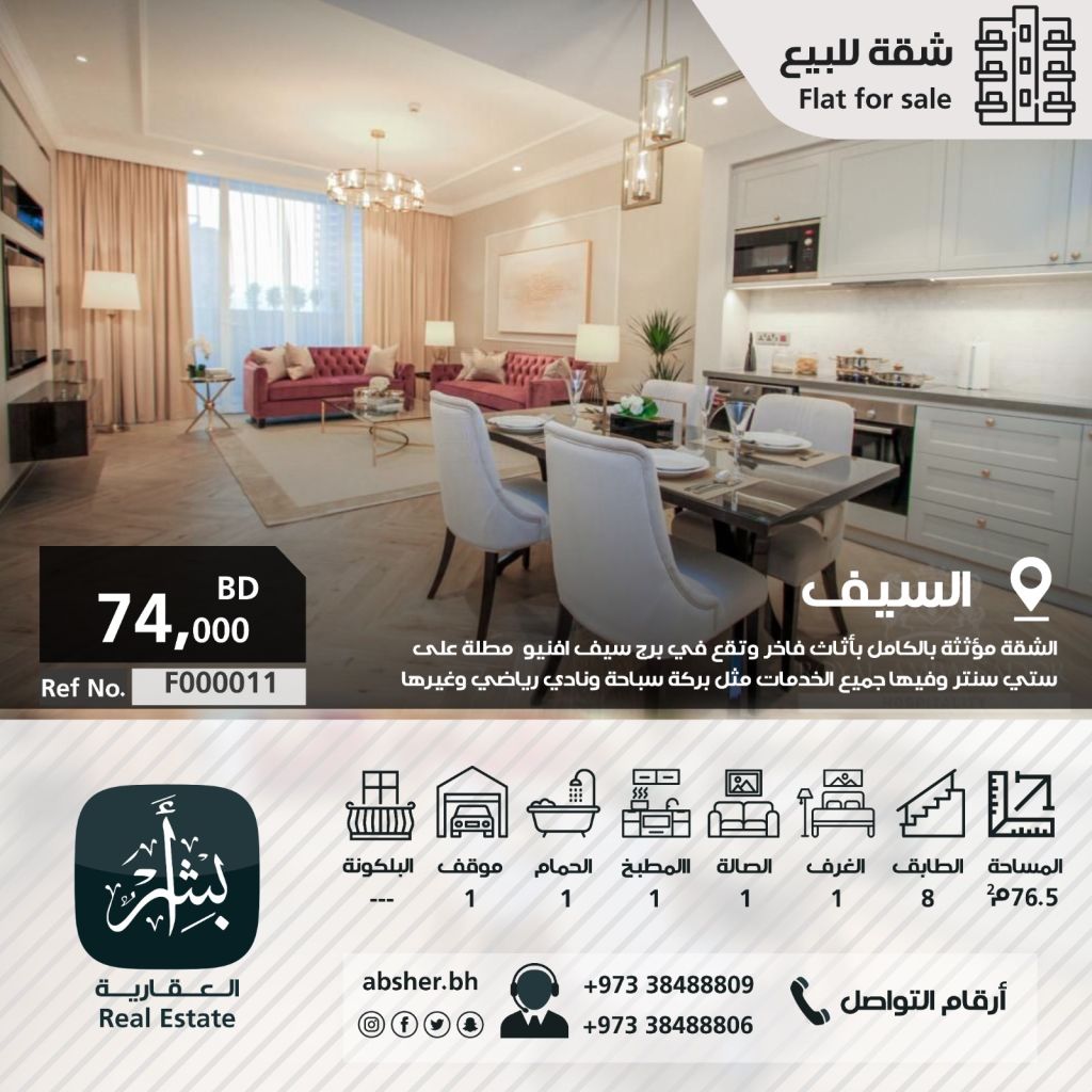 للبيع: شقة مؤثثة في ضاحية السيف، مطلة على مجمع السيتي سنتر في برج سيف أفنيو. مساحتها 76.5 متر مربع في الطابق الثامن. تتكون الشقة من غرفة نوم واحدة وحمام واحد وصالة معيشة مفتوحة على المطبخ. يتوفر في المبنى جميع الخدمات، بما في ذلك بركة سباحة ونادي رياضي وغير ذلك. المطلوب 74 ألف دينار بحريني.