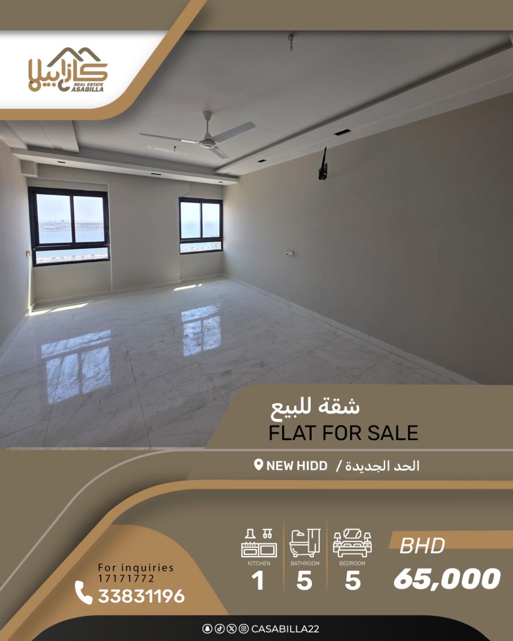 للبيع: شقة تملك حر لجميع الجنسيات بسعر تنافسي جداً، بتشطيب ديلوكس على الطراز العربي، تقع في منطقة هادئة وراقية في الحد الجديدة، قريبة من جميع الخدمات. أولاً، تفاصيل الشقة: مجلس رجال كبير، حمام رجال، صالة عائلية واسعة مع بلكونتين، 4 غرف نوم، 4 حمامات، 2 بلكونتين، ومطبخ كبير. ثانياً، الخدمات والمرافق: مصعدين، موقف سيارات، وقرب من الخدمات والمرافق. ثالثاً، المساحة والسعر: المساحة 200 متر مربع، السعر 65,000 دينار بحريني.